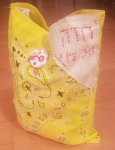 לאחר התלבטות ומחשבה עלה לי רעיון DIY כמובן, תפירת שקית מבנדנה צהובה (צבע השבט, כמובן), עליה רקמתי את צמד המילים 'חזק ואמץ' ומכתב שמתחיל עם המשפט "אם יוצאים מגיעים למקומות נפלאים".